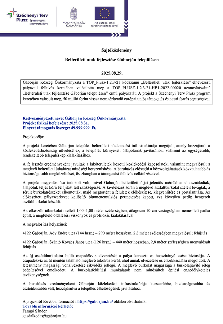 Belterületi utak fejlesztése Gáborján településen